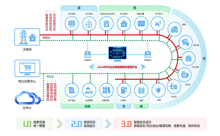 簡介:1.概述 通過在源、網(wǎng)、荷、儲、充的各個關(guān)鍵節(jié)點(diǎn)安裝監(jiān)測、分析、保護(hù)、治理裝置, 通過高性能邊緣計(jì)算網(wǎng)關(guān)采集數(shù)據(jù)并上傳至企業(yè)微網(wǎng)平臺。平臺根據(jù)新的電網(wǎng)價格、 用電負(fù)荷、電網(wǎng)調(diào)度指令等情況,調(diào)整各系統(tǒng)控制策略并遠(yuǎn)程下發(fā),使企業(yè)微電網(wǎng)始終高效穩(wěn)定運(yùn)行, 降低企業(yè)用電成本,實(shí)現(xiàn)能源互聯(lián)、信息互動。 2.應(yīng)用場所 適用于各行業(yè)企業(yè)內(nèi)部微電網(wǎng)管理系統(tǒng)的新建、擴(kuò)建、改建等項(xiàng)目。 3.平臺結(jié)構(gòu) 3.平臺功能 安科瑞AcrelEMS企業(yè)微電網(wǎng)能效管理平臺融合了電力監(jiān)控、電氣安全、照明控制、能源管控、充電樁運(yùn)營管理、分布式光伏監(jiān)測、儲能管理、設(shè)備臺賬、運(yùn)維管理等功能,通過一個平臺、一個APP整體的對企業(yè)用電進(jìn)行集中監(jiān)控、統(tǒng)一調(diào)度、統(tǒng)一運(yùn)維,并且根據(jù)當(dāng)?shù)毓╇姴块T錯峰避峰計(jì)劃提前為企業(yè)制定錯峰避峰方案和預(yù)警,滿足企業(yè)